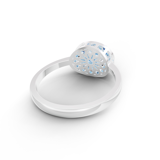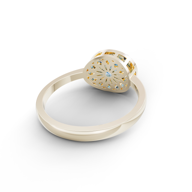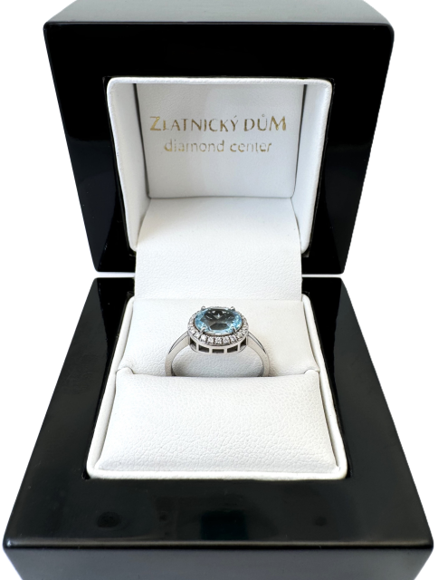 Prsten s oválným středovým topazem velikosti 8x6 mm a váze 1.08 ct obklopen brilianty o váze 0.11 ct je synonymem exkluzivity a elegance.