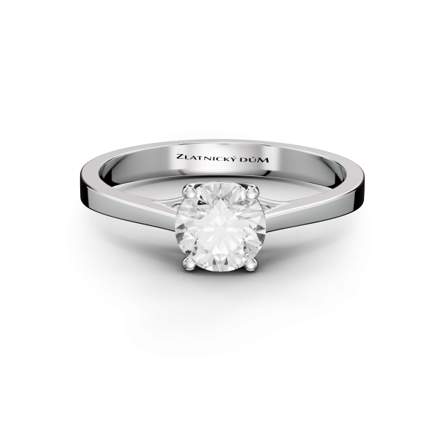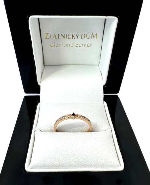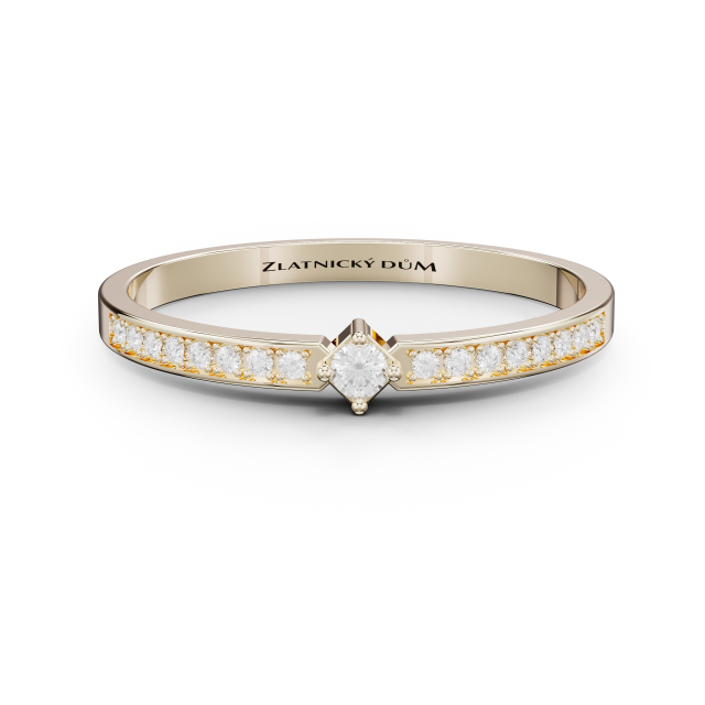 Překrásný zásnubní prsten zaujme zejména svým výrazným třpytem a netradiční korunkou čtvercového půdorysu. Obroučka prstenu je posázena drobnými brilianty, uprostřed prstenu vynikne do hranatého pouzdra zafasovaný briliant o průměru 2 mm.