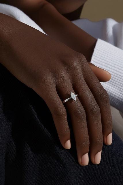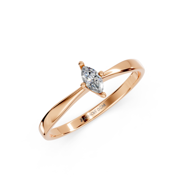 Prsten zdobí centrální diamant v méně obvyklém brusu markýza.