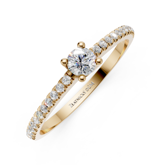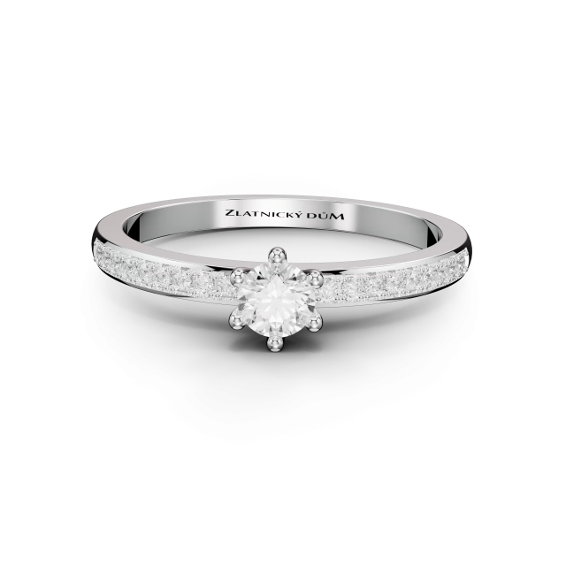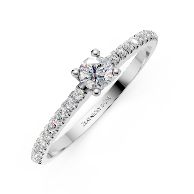 Jemný zásnubní prsten zdobený brilantně broušenými diamanty.