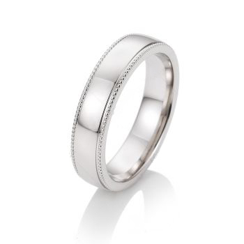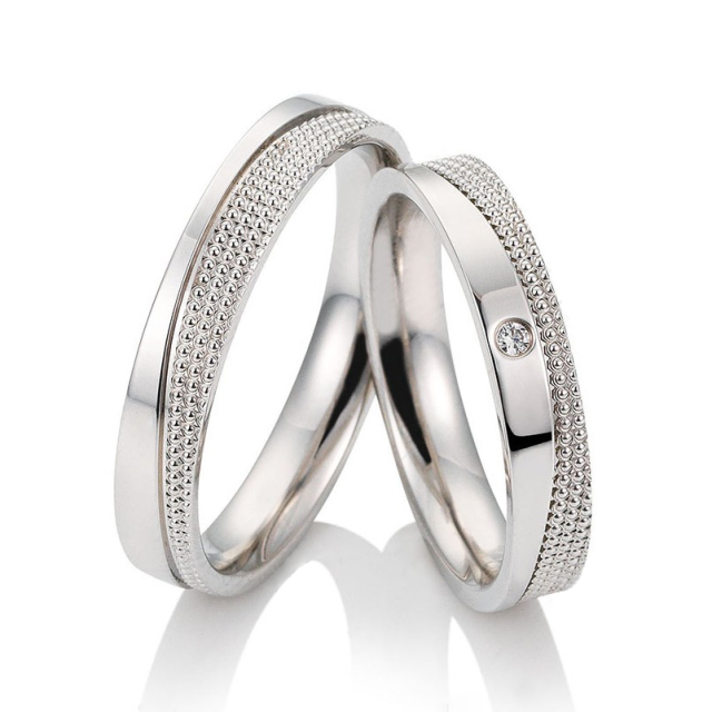 Bicolor snubní prsteny z bílého a žlutého 14kt zlata s vnější rytinou. Dámský prsten je ozdoben briliantem od velikosti 1 mm. Barvy kovů je možné kombinovat podle přání zákazníka (žlutá, bílá, růžová).