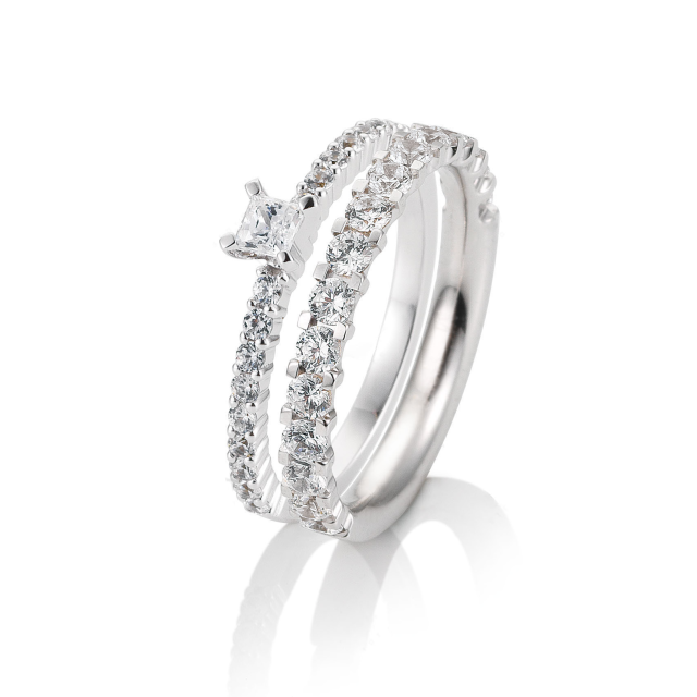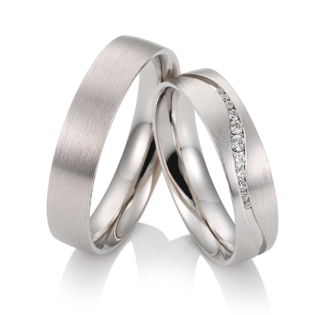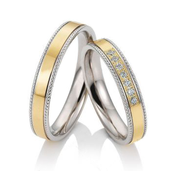 Snubní prsteny ze žlutého 14kt zlata s vnějším matováním. Dámský prsten je ozdoben briliantem od velikosti 1 mm. Barva kovů je možné vybrat podle přání zákazníka (žlutá, bílá, růžová).