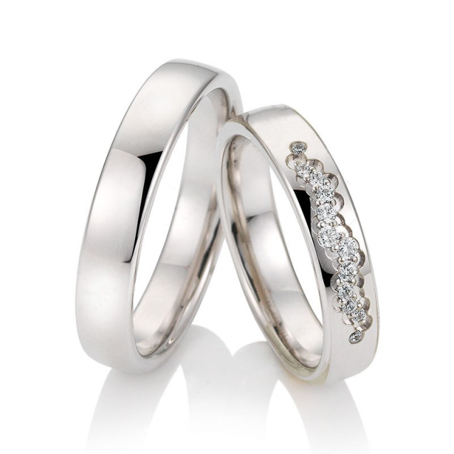 Snubní prsteny ze žlutého 14kt zlata s vnější rytinou. Dámský prsten je ozdoben pěti brilianty od velikosti 1 mm. Barvy kovů je možné zvolit podle přání zákazníka (žlutá, bílá, růžová).