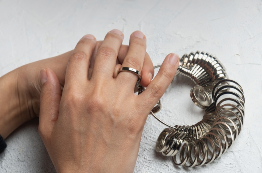 změřte délku v milimetrech – to je obvod prstu = velikost prstenu. Např. (EU velikosti): 52 mm = velikost 52