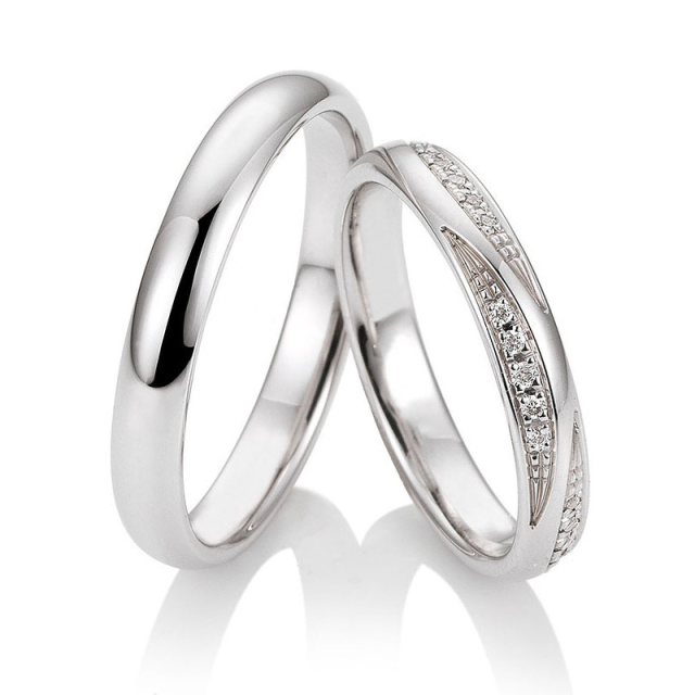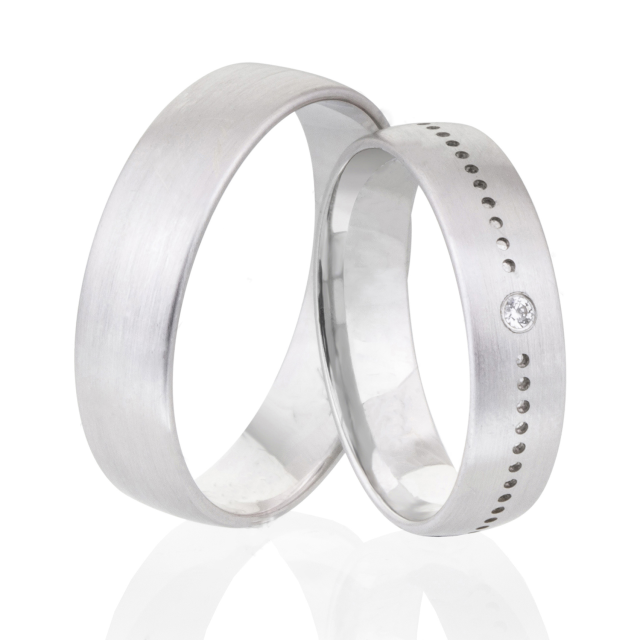 Bicolor snubní prsteny vyrobené ze žlutého a bílého 14kt zlata. Dámský prsten je ozdoben briliantem od velikosti 1 mm. Barvy kovů prstenů lze kombinovat podle požadavků zákazníka (žlutá, bílá, růžová).