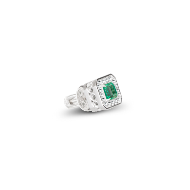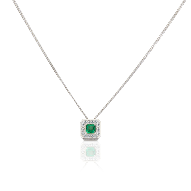 Stylové náušnice a přívěs vyrobeny z bílého zlata. Oba šperky jsou navrženy tak, aby dali co nejvíce vyniknout smaragdům. Jako doplněk jsou pak použity brilianty. Na zlatě je galvanicky aplikována vrstva rhodia za účelem ochrany a dosažení vysokého kovového lesku. Zapínání náušnic bylo zvoleno na zívit.