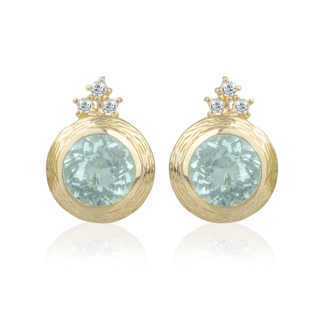 Náušnice jsou vyrobeny ze 14 karátového žlutého zlata. Hlavní dominantou šperku jsou dva krásně zbarvené akvamaríny, které zaujímají největší část šperku. Decentní ozdobu pak dělají tři brilianty v horní části náušnice. Zapínání bylo zvoleno na klapku, které je mezi dámami velmi oblibené.