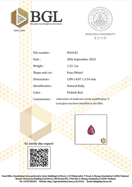 Překrásný přírodní rubín 1,33 ct, brus Pear - hruška.