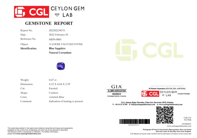 Jedná se o přírodní safír, který je vhodný do šperku, jako centrální kámen, může být doplněn malými diamanty.