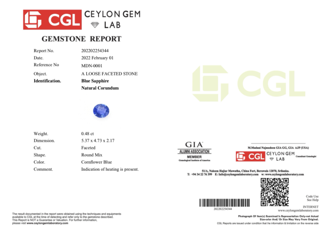 Tento 0,48 karátový safír má krásnou modrou barvu označenou gemologickou laboratoří jako Cornflower Blue což je vzácná modrá barva safírů přeloženo jako chrpově modrá.