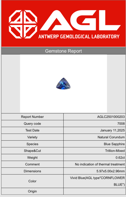 Safír 0,62 ct, který se vyznačuje svým specifickým brusem, jenž má tvar trohúhelníku - trillion.