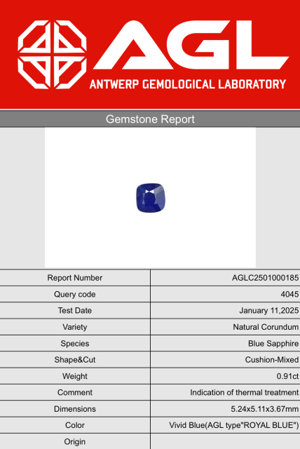 Safír, přírodní - 0,91 karátů, vytěžený na Cejlonu.