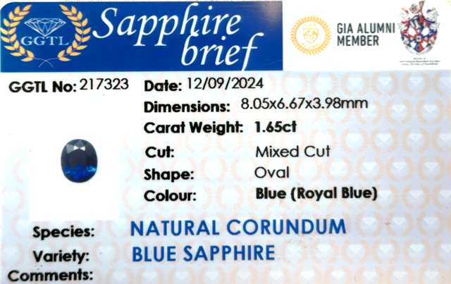 Tento výrazný 1,65 ct přírodní safír s brusem oválu vyzařuje intenzivní živou barvu, která okamžitě zaujme každého. Bez úpravy zahříváním z něj jeho přirozený lesk činí vzácný poklad pro sběratele.