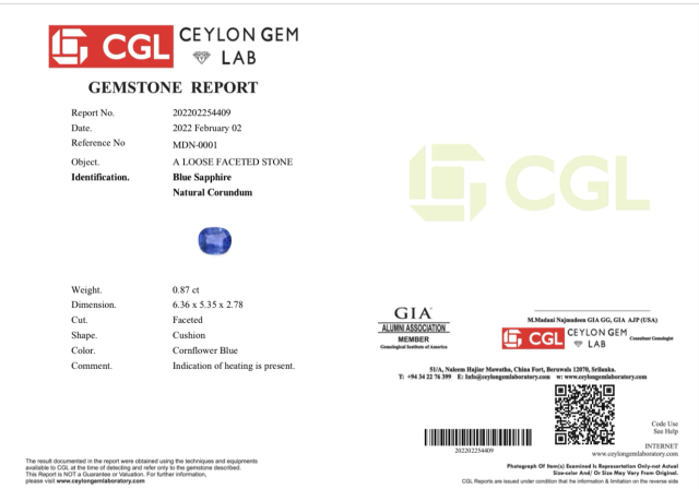 Přírodní modrý Safír, pocházejicí z nejvyhledávanějších dolů na světě. Cejlon je oblast s výskytem nejvzácnějších safírů, především pro svou královskou modrou barvu, která se nikde jinde na světě nevyskytuje.