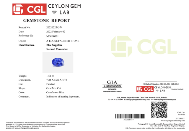 Safír byl překontrolován a ocertifikován laboratorní gemologickou zkušebnou CGL, která je mezinárodně uznávanou laboratoří po celém světě. Certifikát je samozřejmě součástí a je dodán společně se zakoupeným drahokamem.