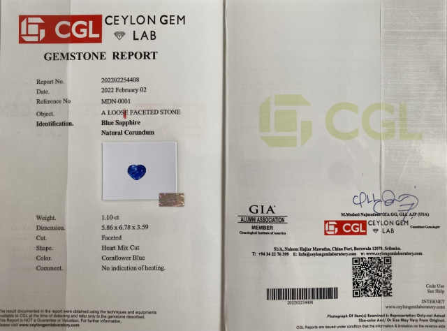 Investiční Safír ve tvaru srdce o velikosti 1,10 ct. Tento Safír je velice zajímavý svým tvarem, který doporučujeme podtrhnout osázením diamantů o velikosti 1,00mm, okolo celého obvodu srdcového Safíru. Toto je Perfektní volba pro výrobu zakázkového zásnubního prstenu. Hodnota takto kvalitního velkého Safíru ve tvaru srdce je na maloobchodním trhu minimálně 2000 USD. Safír má svůj rodný list/certifikát a je naprosto čistý bez inkluzí, má špičkový třpyt a patrné růstové vrostlice identifikujicí přírodní Safír z Ceylonu.