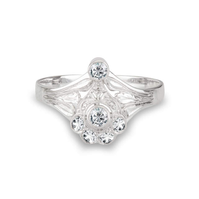 Nádherný starožitný prsten ve stylu Art-deco vyrobený z 18k bílého zlata, osazený 6ks diamantů o celkové váze 0.38 ct.