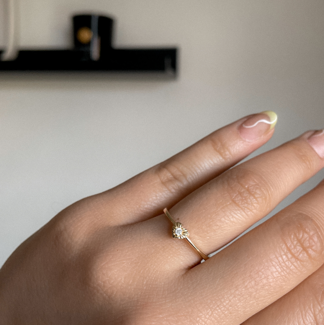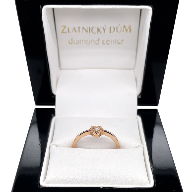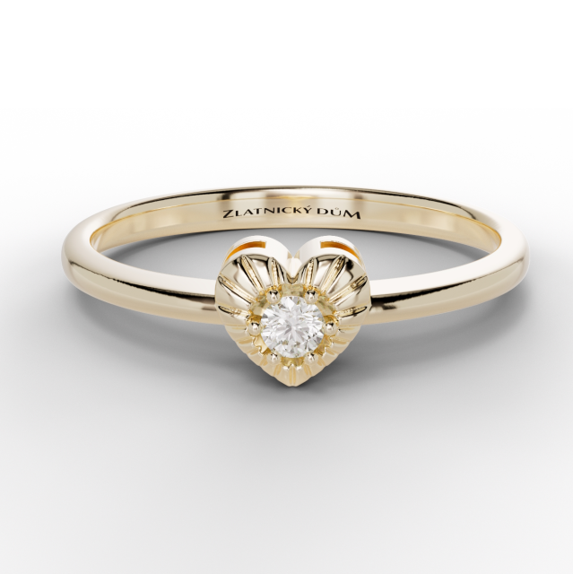 Neobyčejný prsten se srdíčkem ze žlutého, bílého nebo růžového 14kt zlata. Ve středu decentně zafasovaný diamant do hladka. Doporučujeme na drobnější prst.