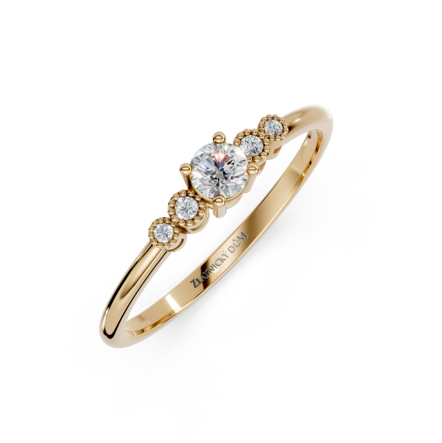 Zásnubní prsten z naší kolekce s centrálním diamantem 3 x 3 mm a postranními diamanty dvakrát 1 mm a 1,2 mm.